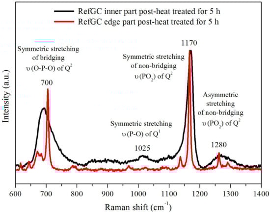 The micro-Raman spectra of the edge crystal and inner glassy parts of the RefGC heat treated at Tp − 40 °C for 5 h are shown in Figure 5. The spectra were normalized at the maximum point (~1170 cm−1). The network of a phosphate glass consists of PO4 tetrahedral units described using the Qn designation, where n represents the number of bridging oxygens (BOs). The spectrum of the glassy part of the RefGC exhibits defined bands at ~700, 1170 and 1280 cm−1 and smaller bands between 800 and 1110 cm−1. A complete analysis of the Raman spectrum of the glass can be found in []. The bands at around 700 cm−1 and at 1025 cm−1 correspond to the symmetric stretching bridging νsym(O-P-O) of Q2 groups and to the symmetric stretching νsym(P-O) of terminal Q1 groups, respectively []. The bands at 1170 and 1280 cm−1 can be ascribed to the symmetric and asymmetric stretching of non-bridging ν(PO2) of Q2 groups, respectively [,,]. This spectrum clearly shows the typical structure of a metaphosphate glass []. The Raman spectrum measured in the crystal part exhibits a reduction between 15% and 25% of the full width at half maximum (FWHM) of the bands attributed to the Q2 groups, confirming the crystallization. Interestingly, the ratio Iνsym(P-O-P)/Iνsym(PO2) between the intensities of the peaks at 700 and 1170 cm−1 increases from 0.5 to 0.7 after the heat treatment. At the same time, a depletion of the peak at 1025 cm−1 associated with the terminal Q1 groups is observed. Thus, these results might be evidence of an increase in the polymerization of the phosphate network after the heat treatment.