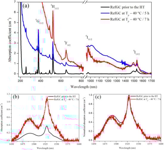 Whole absorption spectra of the RefGC prior to and after the heat treatments (HT) at Tg + 20 °C for 17 h and Tp − 40 °C for 5 and 7 h (a); Absorption spectra (b) and normalized absorption spectra (c) in the range between 1450 and 1600 nm of the RefGC prior to and after the heat treatment at Tg + 20 °C for 17 h and Tp − 40 °C for 7 h.
