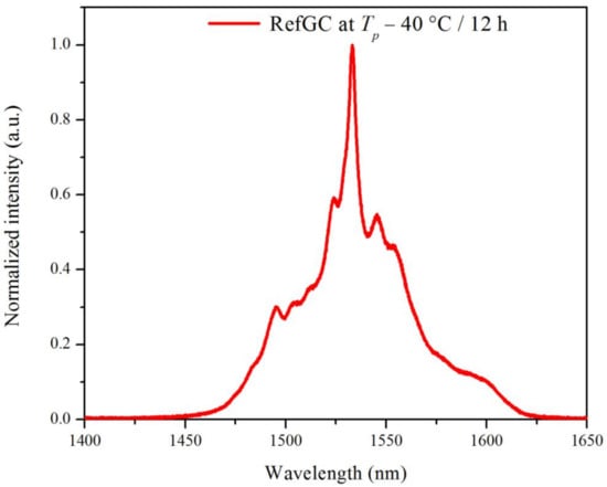 Normalized emission spectrum of the RefGC after the heat treatment at Tg + 20 °C for 17 h and Tp − 40 °C for 12 h.