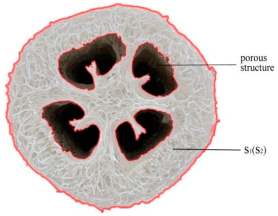 where ρ is density of luffa sponge columns in kg/m3, M is the mass of luffa sponge column in kg, and v is the volume of luffa sponge columns in m3. S1 and S2 are the areas of the top and bottom transverse section from luffa sponge column (excluding the porous structure on the transverse section), respectively. The transverse section of luffa sponge column is shown in Figure 4. The area is expressed in m2, while H, the height of luffa sponge column, is expressed in m.