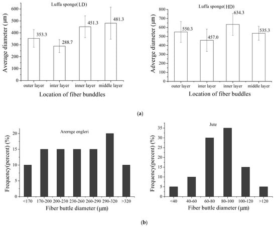 (a) The average diameters of fiber bundles taken from luffa sponge; and (b) diameter distribution of fiber bundles taken from Arernge engleri and jute.