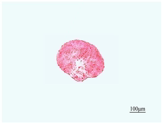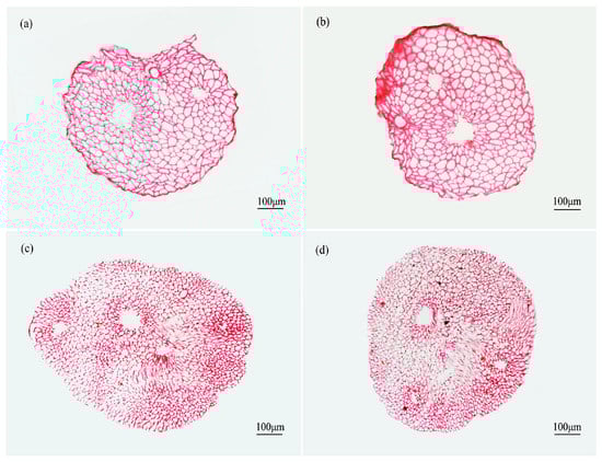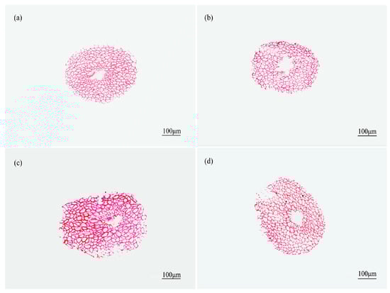 The transverse sections of the safranin-stained fiber bundles clearly revealed lignified tissue. According to Figure 10, Figure 11 and Figure 12, the diameters of fiber bundles from HD luffa sponge were significantly larger than that of LD luffa sponge. Besides, the fiber bundles from Arenga engleri had smaller diameters than those of luffa sponge. It can be observed that fiber bundles of luffa sponge primarily consisted of fiber cells. As shown in Figure 10 and Figure 11, there were cavities, with a small number of vessels and phloem tissue nearby, around the center of fiber bundles []. However, as shown in Figure 12, similar phenomenon could not be observed in the fiber bundles of Arenga engleri. Moreover, it was also discovered that there were two or more cavities with uneven distribution in the fiber bundles of HD luffa sponge, while there was only one cavity around the center of fiber bundles in LD luffa sponge.