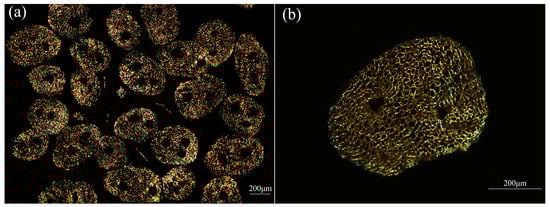 Transverse section image of fiber bundles taken fromHD luffa sponge and observed by polarized-light. (a) is the transverse section image in low-magnification times, and (b) is in a high magnification times. (the noticeable dark region is the area occupied by non-fiber including cavity, vessels, and phloem tissue).