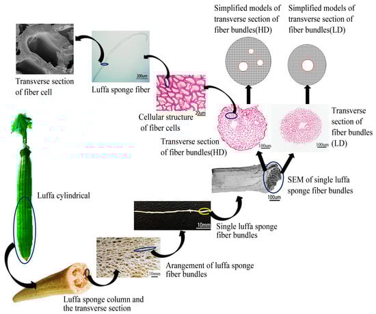 The luffa sponge (LS), commonly referred to as vegetable sponge or luffa cloth, is obtained from matured dried fruit of luffa cylindrica. It consists of crisscrossed fibers and presents a three-dimensional reticular structure. Photographs of luffa cylindrica and luffa sponge are shown in Figure 1. The luffa sponge is a rich resource for plants and is cultivated in the tropical countries of Asia and Africa, and some sub-tropical areas. The plantation areas in China include Jiangxi, Henan, Sichuan, Guangdong, Jiangsu, Anhui, and a few other places [,,]. The luffa sponge is a low-density, eco-friendly resource that is non-toxic, biodegradable, and has stable physical and chemical properties [,]. There are two common varieties of luffa sponge, namely, luffa sponge of low density and luffa sponge of high density (as shown in Figure 2), among which the luffa sponge of high density is the improved variety []. The luffa sponges have a lengthy history of being studied in China. The Chinese classic “Compendium of Materia Medica” recorded about the luffa performance 400 years ago and specified that “luffa sponge, with sweet and clod nature, has the effect of clearing heat, cooling blood, detoxifying, promoting circulation of blood and dredging collaterals”. The luffa sponge has been used as cleaning equipment (for instance, as a dish cloth), insole materials, and pillow filling materials. The advancement in science and technology has led to luffa sponges being widely used in several fields such as pharmaceutical engineering [,], environmental engineering [,,], biotechnology [,,], and industrial products [,,]. Since luffa sponges are porous material with a high degree of lignification [,,], they have great potential for applications in composite materials and fabric fibers.