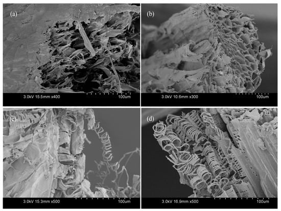 Furthermore, as shown in Figure 16c,d, abundant spring-like spiral vessels were observed in the fiber bundles. It was observed that the behavior of pullout spiral vessels was similar to that of the spring lost elasticity.