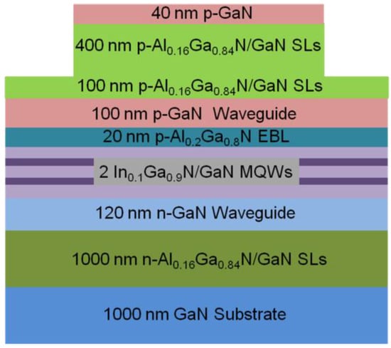 The laser structure under study is shown in Figure 1, which is a conventional structure and has been reported in many studies [11,12]. It is composed of a 1000-nm-thick n-type GaN layer (Si: 3 × 1018 cm−3), a 1000-nm-thick n-type Al0.16Ga0.84N/GaN superlattices (SLs) (Si: 3 × 1018 cm−3), a 120-nm-thick n-type GaN lower waveguide layer (Si: 5 × 1017 cm−3), the quantum-well (QWs) active region, a 20-nm-thick p-type Al0.2Ga0.8N electron blocking layer (EBL) (Mg: 4 × 1019 cm−3), a 100-nm-thick p-type GaN upper waveguide layer (Mg: 1 × 1019 cm−3), a 500-nm-thick p-type Al0.16Ga0.84N/GaN SLs (Mg: 2 × 1019 cm−3), and a 40-nm-thick p-type GaN contact layer (Mg: 1 × 1020 cm−3). The QWs consist of two 2.5-nm-thick undoped In0.1Ga0.9N well layers and three 14-nm-thick n-GaN barrier layers (Si: 1 × 1017 cm−3).