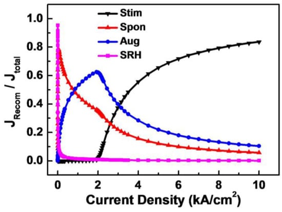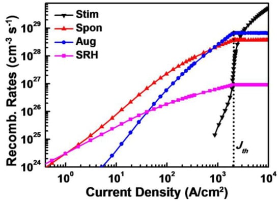 In the simulation, the recombination rates of SRH recombination, spontaneous emission, Auger recombination, and stimulated emission of GaN-based LDs at various injection current levels were calculated. By integrating all the recombination rates at various currents, the ratio of SRH recombination rate over the total recombination rate can be obtained, which is equal to the ratio of SRH recombination current over the total injection current as no leakage current exists. The same method could be applied to the recombination current ratios of spontaneous emission, Auger recombination, and stimulated emission. As shown in Figure 5, at the threshold current density of 2.1 kA/cm2, the currents supplied to Auger recombination, spontaneous emission, SRH recombination, and stimulated emission are calculated to be 60.9%, 33.8%, 4.5%, and 0.8%, respectively. Most of the injection current feeds Auger recombination which is proportional to the third power of carrier density. Since the carrier density in QWs is clamped after lasing, all recombination rates are saturated except the stimulated emission one. The stimulated emission current increases dramatically with increasing injection current and dominates the injection current very quickly, which makes the ratio of the current supplied to Auger recombination, spontaneous emission, and SRH recombination decrease. At an injection current density of 10 kA/cm2, the current supplied to Auger recombination, spontaneous emission, and SRH recombination are reduced to 10.4%, 5.8%, and 0.1%, respectively. The stimulated emission current is increased to 83.7%.