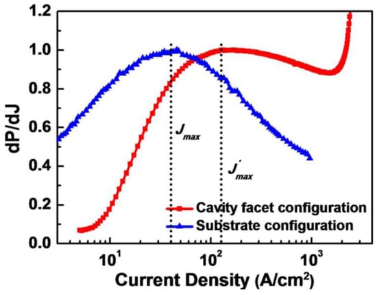 The dP/dJ–J curves of a 405 nm GaN-based LD measured from the cavity facet side (red) and the substrate side (blue), respectively.