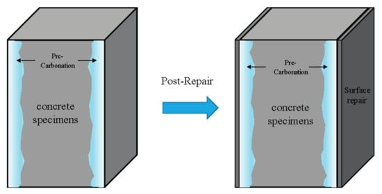 While the previous studies mentioned above have predicted the carbonation of only concrete without considering repair materials, there have been several other works which have also taken repair materials into consideration in their studies. The accelerated carbonation test for the durability of concrete was mentioned in the Chinese National Standard GB/T 50082-2009 titled “Standard for test methods of long-term performance and durability of ordinary concrete” [27]. The Architectural Institute of Japan (AIJ) [28] also assigned coefficients to different types of repair materials for the prediction of carbonation. In addition, Köliö et al. [29] investigated the corrosion of a reinforcement bar induced by the carbonation of a concrete repair material additive. However, the carbonation prediction equations derived in these studies only considered the carbonation in the original concrete, or carbonation in a concrete to which a repair material had already been applied.