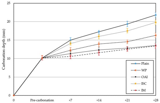 Figure 4 also shows the measured carbonation depths for 7 days after the initiation of accelerated carbonation following the application of the repair materials and error bar for corresponding specimens. It can be observed that the unrepaired specimen has a carbonation depth of about 14.98 mm, which is 4.85 mm greater than that after pre-carbonation. This figure shows the carbonation depth after the application of the repair materials as well as that obtained under accelerated conditions. Comparison of the carbonation depths after 28 days for the different repair materials reveals that the value for ISC is the highest (~19.81 mm), while that for IM is the lowest (13.39 mm). It is may be due to that IM contain acrylic polymer that resist the penetration of CO2 toward concrete and work as barrier.