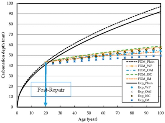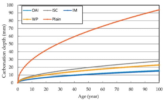 Figure 6 compares the predicted progression of the carbonation depth for the different repair materials up to 100 years of age. The carbonation depth after 10 years of repair by IM is 4.74 mm, from which it can be deduced that the repair affords a carbonation resistance effect of about 25.26 mm compared to the unrepaired sample. Table 5 compares the carbonation depths for the different repair materials.