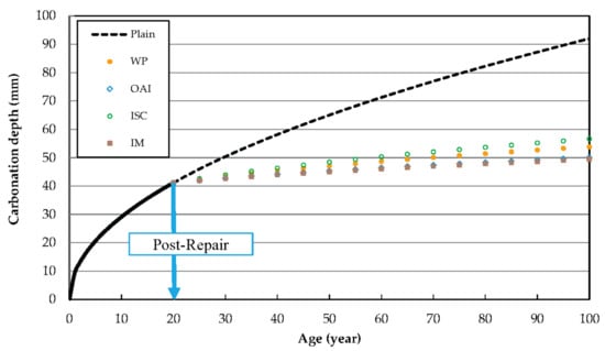 Figure 7. Predicted post-repair progress of carbonation using different repair materials.