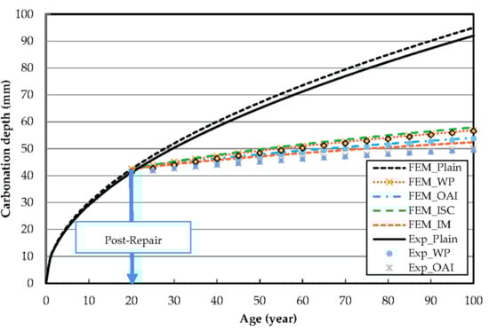 3.3.2. FDM Analysis of the Post-Repair Carbonation Depth