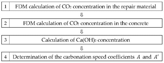 Figure 9 shows the flowchart of the FDM analysis. The movement of CO2 in concrete was set to occur in one direction but the movement of Ca(OH)2 in the concrete was not considered. Table 8 and Table 9 specify the input variables for the concrete and repair materials, respectively [34].