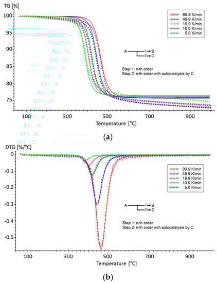 (a) Thermogravimetric curves and (b) differential thermogravimetric curves of the kinetic decomposition model with a physical meaning obtained using NETZSCH Thermokinetic software for T700/M21 [6].