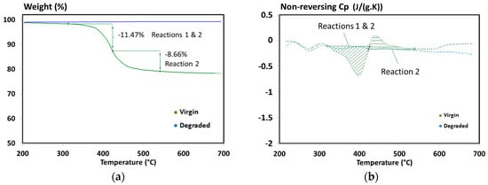 (a) Remaining mass; and (b) non-reversing specific heat capacity obtained during a simultaneous thermal analysis carried out under nitrogen to determine the heats of decomposition of T700/M21 [6].