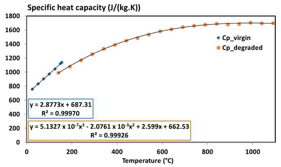 Specific heat capacity of the virgin and degraded materials obtained with DSC Q100 and STA F1 measurements, respectively [6].