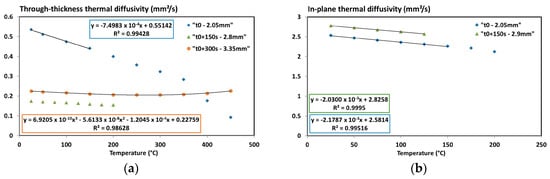 The through-thickness thermal diffusivity of a virgin coupon (written t0 in the caption) and two degraded coupons (t0 + 150 s; t0 + 300 s) as a function of temperature were measured (Figure 7a). Coupons were exposed to the fire test developed by Tranchard et al. [1] for 150 s and 300 s to get a measurement as a function of the decomposition degree, i.e., half-degraded and degraded. The thicknesses of each coupon are indicated in the caption of Figure 7.