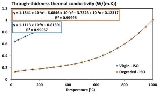 A linear segment is considered for the virgin state up to 150 °C. A three-degree polynomial expression is considered for the degraded state. This behaviour is consistent with the literature since it is reported that the thermal conductivity of degraded material varies with a third power of temperature (for the through-thickness only) due to the pores present inside the material which generates internal radiation [44,45]. Generally, this third power term is given as a function of the pore diameter and of the radiative exchange factor. The higher the size of pore, the greater must be the radiation inside the porous network [44,45].