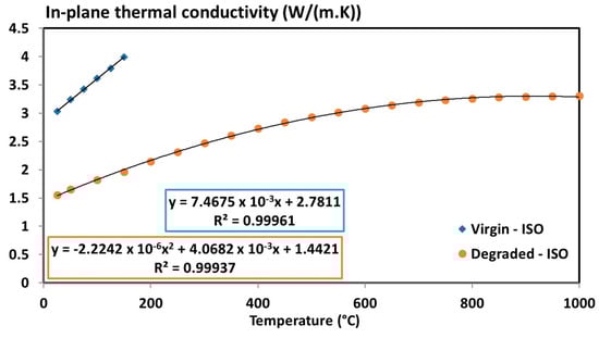 The in-plane thermal conductivities of the virgin and degraded states are presented in Figure 9. The results show that the T700/M21 exhibits an anisotropic behaviour with an in-plane thermal conductivity 11 times higher than the through-thickness thermal conductivity before 500 °C and six times higher after 500 °C. As evidenced previously [32,46], a factor of 8 can be observed between the through-thickness and in-plane thermal conductivity. These results are thus consistent with the literature data. A linear variation of the thermal conductivity of the virgin material up to 200 °C and a second degree polynomial expression for the degraded material is obtained.