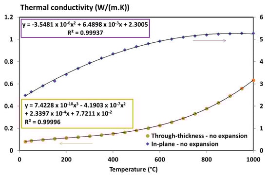 Hence, the final thermal conductivity tensor determined previously have to be multiplied by the ratio 2.1/3.35 in through-thickness direction (the thickness of the sample divided by the “without-expansion” thickness of the coupons, eequ), and divided by its ratio in longitudinal direction. Figure 11 shows the updated of the interpolation curves with thermal expansion taken into account in the thermal conductivity expressions.