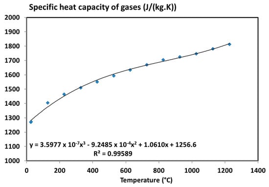 The specific heat capacity of gases was then calculated as a function of the temperature (Figure 12). It can be expressed using a third-degree polynomial interpolation (as commonly used for specific heat of gases in literature [50]).