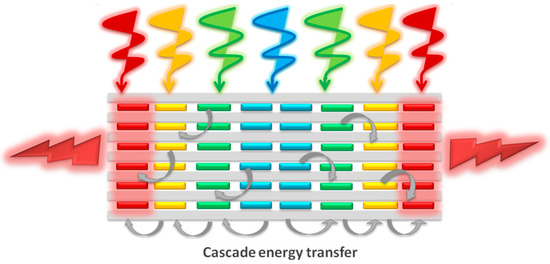 One of the main requirements for the proper functioning of an artificial antenna system is the ability to harvest and transport the light to an acceptor moiety with the desired energy (Figure 1). In this sense, the excitation energy transfer (EET) appears as the key factor ruling the effectiveness of the process. Therefore, a thorough understanding of the parameters controlling this phenomenon is necessary, such as the ratio of donors and acceptors, interchromophoric distances, relative orientations and spectral overlap [13]. The accurate control of all of these variables leads to the development of competitive and efficient antenna systems with potential applications in photonics, optical coding, biosensing, catalysis, photosynthetic, logic devices and theranostics, among others [14,15,16].