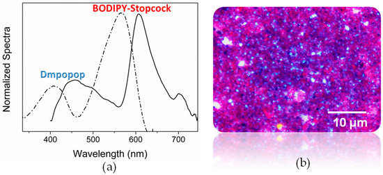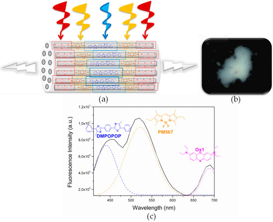 The herein presented antenna system is composed of the sequential insertion of Dmpopop-PM567-Ox1 dyes into the zeolitic channels of disc-shaped crystals (see Section 3.2 for details and Table 1) [32]; in particular, following the aforementioned sequential order, first the donor Dmpopop, then the BODIPY and, finally, the oxazine. These dyes kept their identity inside the channels, in spite of the imposed proximity by the constrained framework, ruling out intermolecular aggregation and thereby displaying their characteristic absorption bands spread along the UV-Vis region [32]. As a result, this antenna entails an effective light harvesting over a broad spectral region (Table 1). After selective excitation at the UV region, where just the first energy donor (Dmpopop) absorbs, its own emission is recorded but followed by that from PM567 and the last energy acceptor Ox1 emission band (Figure 4). Therefore, this hybrid material undergoes FRET (see spectral overlap in Figure S1, which enables through-space FRET) as red emission is attained upon excitation far away from the long-wavelength absorption of oxazines, but partial, since the emission from the donors is not completely quenched and the corresponding fluorescence of each chromophore is simultaneously detected. Nonetheless, the sum of all of these emissions covering the whole visible spectrum leads to white-light emission (Figure 4) in which the energy output can be finely tuned over a broad region just using suitable filters [33,34].
