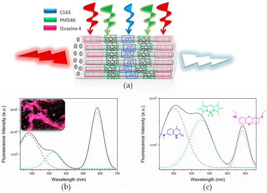 Such evolution is a consequence not only of the ameliorated FRET efficiency, but also of the enhanced fluorescence quantum yield of the final energy acceptor Ox4 with regard to Ox1 [35]. As a result of this synergistic effect, the donor fluorescence quenching by FRET is more effective in profit of the emission from the final and brighter red-edge emitting Ox4 acceptor. Therefore, the control of the energy transfer efficiency together with the improvement of the fluorescence performance of the emitting final energy trap enables the modulation of the emission window, thus passing from the detection of emission bands with similar intensity across the visible region (white-light in Section 2.1.1) to a predominant red emission, keeping always a broadband absorption of the incoming light. Such fine modulation is achieved just by a careful selection of the encapsulated dyes.
