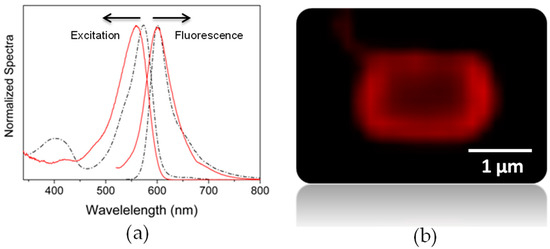 (a) Normalized excitation and emission spectra of the BODIPY stopcock grafted to disc-shaped LTL zeolite crystals (solid) and free in toluene (dash dotted); (b) Fluorescence microscopy image of a single microsized LTL crystal functionalized with the BODIPY stopcock.