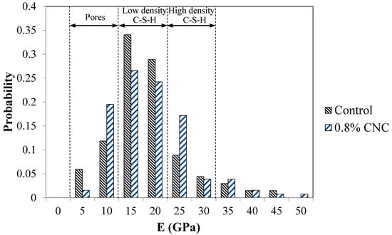 - The statistical nanoindentation measurements showed a small increase in the volume fraction of high density C-S-H and a decrease in the volume fraction of low-density C-S-H in the mixture with CNC compared to the control mixture.