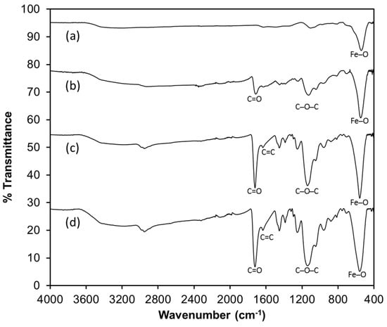 The synthesized sorbents were characterized by Fourier transform infrared spectroscopy (FTIR) in order to evaluate the functional groups present in the solids (Figure 2). For the magnetite (Figure 2a), a band at 560 cm−1 is characteristic for the bending vibration of the Fe–O bonds; this is also observed in the modified sorbents (b–d). Bands observed at 1137 cm−1 and 1722 cm−1 correspond to the presence of C–O–C and C=O groups in the magnetite-polymer (Figure 2b–d) due to the presence of ethylene glycol dimethacrylate (EGDMA) as a cross-linking agent. For the spectra of the magnetite coated with 1-allyl-3-methylimidazolium chloride as monomer (Figure 2c,d), a band at 1635 cm−1 characteristic of the C=C bond of the imidazolium ring is observed [25].