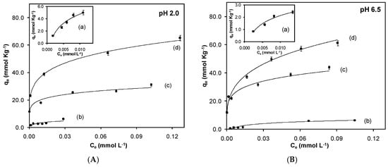 The experiments to evaluate the equilibrium of adsorption were performed at pH values of 2.0 and 6.5 in order to evaluate the effect between the surface charge and the chromium(VI). Figure 4 shows the adsorption isotherms for the synthesized sorbents.