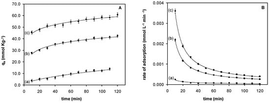 Adsorption kinetics: (A) Adsorption capacity with respect to contact time and (B) Rate of adsorption with respect to contact time (pH 2.0); (a) Fe3O4-MAA; (b) Fe3O4-MAA-IL; (c) Fe3O4-IL.
