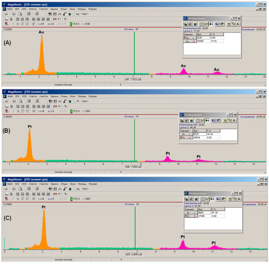 X-ray spectral analysis of (A) the surface of a non-modified 4 mm DRP-C220AT “DropSens” gold planar electrode; (B) the same surface after modification by Pt using electrolysis (Pt-1); and (C) the Ptlayer obtained by electrodeposition (Pt-2).
