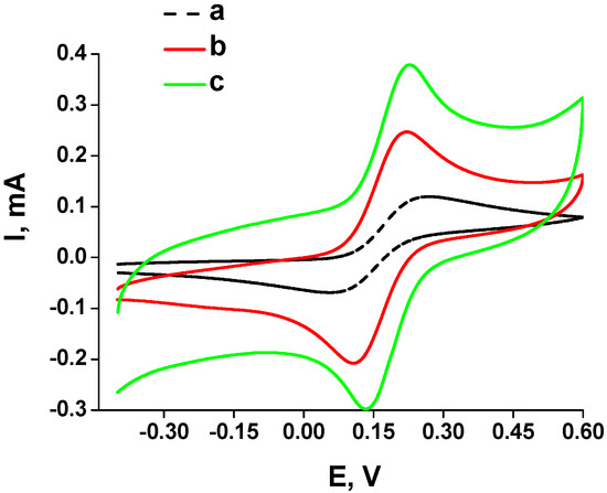 The detailed analysis of electrochemical characteristics of the non-modified planar electrode and the planar electrodes modified by platinum was performed by cyclic voltamperometry in electrochemical cells with an electrolyte solution of K4Fe(CN)6 in KCl (Figure 4). As can be seen from Figure 4a, modification of the gold planar electrode by platinum significantly increased the electroconductivity of the working electrode (curves b and c) when compared with the non-modified electrode (curve a). Conductivity of the Pt-1-modified electrode increased 2.5-fold and that of the Pt-2-modified electrode increased more than four-fold compared to the non-modified electrode. The observed phenomenon of improving the electrochemical parameters of chemoelectrodes is expected to significantly increase the sensitivity of prototypes of FA-selective chemosensors.