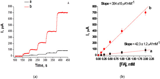 The Pt-modified electrodes were used for construction of FA-selective chemosensors. For this purpose, chronoamperometric analysis of the Pt-1 and Pt-2 electrodes was performed upon addition of increasing concentrations of FA. The sensor output was measured (Figure 5a) and used for building calibration curves for each of the electrodes (Figure 5b, curves a and b). Both sensors exhibited a linear response up to 2 mM of FA. However, the chemosensor based on the Pt-2 electrode showed much higher sensitivity than the Pt-1 electrode. As can be seen from Figure 5, the Pt-2 sensor generated a current of 704 µA upon the addition of 2 mM FA, whereas the Pt-1 sensor generated a maximal output of only 84 µA under the same conditions (Figure 5a). The sensitivity of both chemosensors can be characterized as a specific response calculated from slopes of the calibration curves presented in Figure 5b. The sensitivity values of the constructed chemosensors were very high: 3400 A·M−1·m−2 for the Pt-1-based chemosensor and 28180 A·M−1·m−2 for the Pt-2-based electrode. It can be assumed that preparation of the chemosensor using the cyclic voltammetry technique enabled a more than eight-fold increase in sensitivity compared to the chemosensor produced electrochemically [20]. The detection limit for the Pt-2-based electrode determined from a chronoamperometric curve is 0.05 mM for FA (Figure 5a).