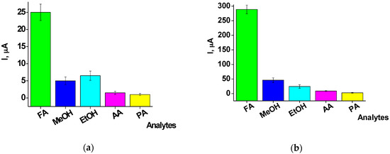 The most important characteristic of chemosensors is their selectivity to the target analyte. The response of both chemoelectrodes to several additional compounds which were applied at the same molar concentration was therefore tested. These compounds included methanol, ethanol, acetaldehyde, and propylaldehyde. The results presented in Figure 6 show that both chemosensors exhibited a high sensitivity only to FA, whereas responses to the otheranalytes were significantly lower. The sensitivity of the Pt-1 and Pt-2 electrodes for methanol was 20.0% and 16.6% of the response for FA, respectively (Figure 6a). For ethanol, the respective values were 26% and 8.3%, for acetaldehyde the values were 6% and 3%, and for propylaldehyde they were 2% and 1% (Figure 6b). It should be noted that the selectivity of the Pt-2 chemosensor towards FA exceeded that of the Pt-1 electrode in all cases.