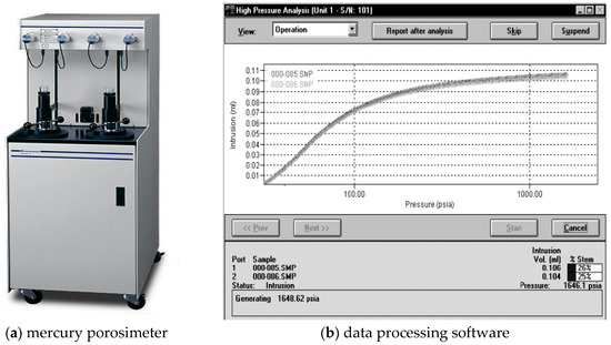 Each specimen for testing was crushed into particles with a size ranging from 8 to 10 mm, which were then vacuum-dried at 25 °C for 12 h. Afterward, sampling was performed on each specimen. Pore structure testing was conducted on an AUTOPOREIV 9500 mercury porosimeter (pore size measurement range: 360 μm–5.5 nm) manufactured by Micromeritics (Norcross, GA, USA). The instrument and data processing software are shown in Figure 2. Each collected specimen was fixed and sprayed with gold, and then, its micromorphology was analyzed by using a scanning electron microscope (FEI Quanta200, FEI, HL, USA).