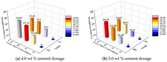 As seen in Figure 4, higher cement contents resulted in lower strength loss ratios following the freeze–thaw cycles. The strength loss ratio of all the specimens with a cement content of 4.0% was relatively high (>14%) after 5 freeze–thaw cycles but decreased as the number of freeze–thaw cycles increased. For each specimen with a cement content of 5.0%, the highest strength loss occurred after the specimen underwent 5–10 freeze–thaw cycles. It can be seen from Table 5 that the tests results are acceptable because of the small variation coefficients.