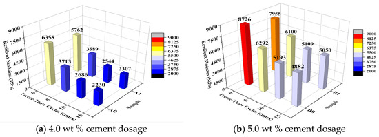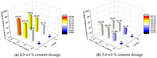 Based on Figure 5, the dynamic compressive resilient modulus of the specimens of each group decreased as the number of freeze–thaw cycles increased. As a component that provides flexibility, EA, when mixed in CSG, resulted in an increase in the flexibility of the CSG system within a small range and a decrease in its dynamic compressive resilient modulus to a small extent. After 5 and 10 freeze–thaw cycles, the dynamic compressive resilient modulus of all the EA-modified specimens was lower than that of the unmodified specimens. However, after 15 freeze–thaw cycles, the dynamic compressive resilient modulus of all the EA-modified specimens was higher than that of the unmodified specimens. Of all the specimens, the EA-modified specimens with a cement content of 5.0% retained their dynamic compressive resilient modulus at the highest percentages after the freeze–thaw cycles.