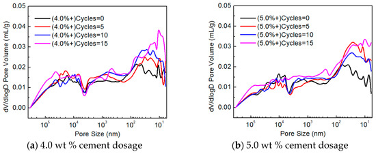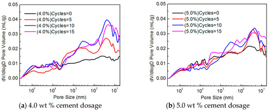 Figure 9 shows the pore size distributions of the EA-modified CSG specimens with various cement contents. As seen, the number of pores in the EA-modified CSG increased as the number of freeze–thaw cycles increased. In contrast to the unmodified CSG, the number of pores in the EA-modified CSG increased to a relatively small extent as the number of freeze–thaw cycles increased, with most of the pores being below 50 nm in size.