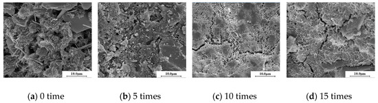 Figure 8 shows the microstructure of the CSG specimens with a cement content of 5.0%. Their micromorphology shows that as the number of freeze–thaw cycles increased, the structure became more compact and a relatively large number of cracks formed because of freezing-induced expansion; in addition, the cracks at the aggregate–cementing material interface were more visible, and the CSG structure deteriorated and sustained damage.