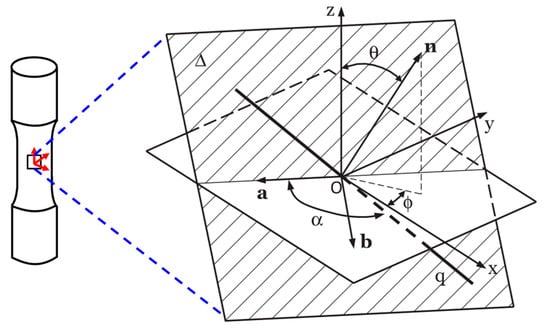 A generic material plane represented by its unit normal vector as shown in Figure 1 can be defined by the angles and . According to the current schematization in Figure 1, is the angle between the projection of unit vector n on the plane and the -axis and is the angle between unit vector and the -axis. While the second reference system, Oanb, can also be defined by the following three unit vectors determined by the angles and as defined above: