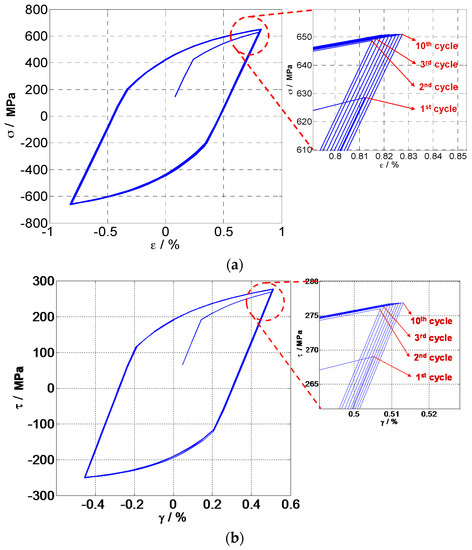 Thus, the FS model can be implemented to predict life by using uniaxial tension-compression fatigue data. Based on the above uniaxial fatigue data, material constants of the FS and WB models for GH4169 were estimated as and , respectively. Approximate modeling of material cyclic behavior is needed to correctly characterize the material cyclic response. The kinematic hardening was modeled by using the non-linear Chaboche model [47] with three backstresses. Cyclic stress-strain responses of critical planes have been analyzed to determine the input of stress and strain tensor for life prediction. The relationship of axial stress-strain and torsion stress-strain is shown in Figure 5, which shows that the hysteresis loop at the second cycle and third cycle begins to stabilize with the increase of loading cycles. Due to the plastic deformation reached at the first load application and consequent lower residual stresses, the material exhibited a certain cyclic hardening. Jiang et al. [53] found that fatigue damage produced by the stable stress-strain hysteresis loop can provide a good estimate of fatigue life when the transient cyclic behavior is not pronounced and a stabilized stress-strain response can be identified. In this analysis, fatigue life prediction is conducted based on the stress-strain state of GH4169 at the second load cycle, especially for the WB model which includes the mean stress term.