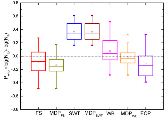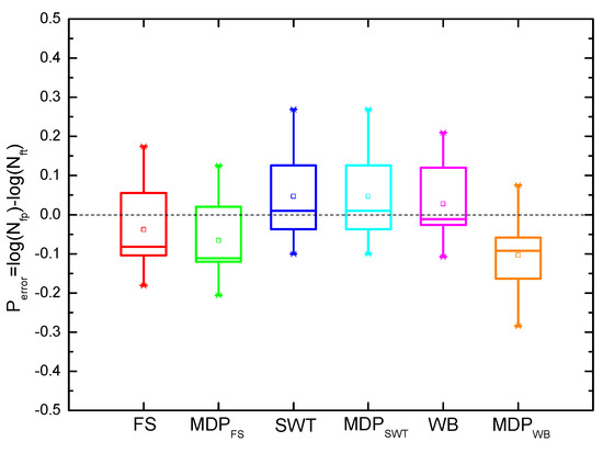 Life prediction results of these critical plane models for uniaxial tension-compression fatigue are shown in Figure 6. Maximum damage parameter (MDP) represents the predicted lives of these models with the critical plane of maximum damage parameters. A good agreement for these models being considered can be observed especially by applying the SWT and MDPSWT with 92.8% of the results within the scatter band. For the FS and WB models with different critical planes, the life prediction results are within the band. In order to more visually show the differences between these models, a probability analysis has been conducted on model prediction errors as [27,28]: