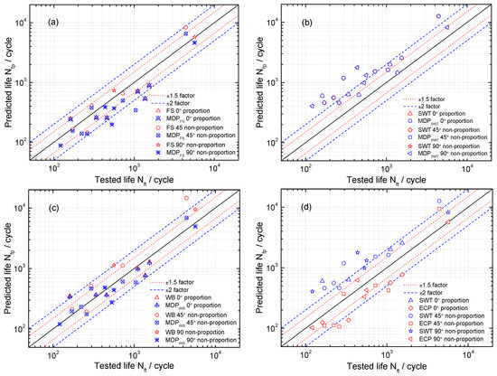 A comparison of predicted life using (a) Fatemi-Socie (FS) and MDPFS parameters; (b) SWT and MDPSWT parameters; (c) Wang-Brown (WB) and MDPWB parameters and (d) SWT and energy-critical plane (ECP) parameters under multiaxial fatigue loadings.