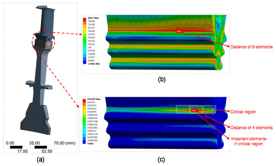 FEA result of the turbine blade at the 0-maximum-0 cycle was shown in Figure 10. It shows that the most dangerous region is at the fir-tree region, which is consistent with the conclusion of Sinclair and Cormier [8] that the contact stress analysis of dovetail attachments is critical in the life prediction of turbine blade to disk attachments. There is a plastic strain field at the first tooth of the fir-tree tenon due to the compression stress caused by the geometric volume expansion due to centrifugal loads of the blade at high temperatures. The locations with the maximum von-Mises stress and the maximum plastic strain are different. The position of the maximum von-Mises stress is a distance of 8 elements away from the edge of the fir-tree root and the position of maximum equivalent plastic strain is the distance of 4 elements. It is worth mentioning that the maximum shear strain and the maximum damage parameter are not in the position of the maximum von-Mises stress, but in the region near the maximum equivalent plastic strain, which is similar to the conclusions of Maktouf [50]. It was found that the four elements at the region of maximum equivalent plastic strain are the most important elements to be considered for life prediction. Determine the element by the maximum value of shear strain, normal strain, or damage parameter (determined by the definition of different critical planes) to be used for fatigue life prediction of the turbine blade.