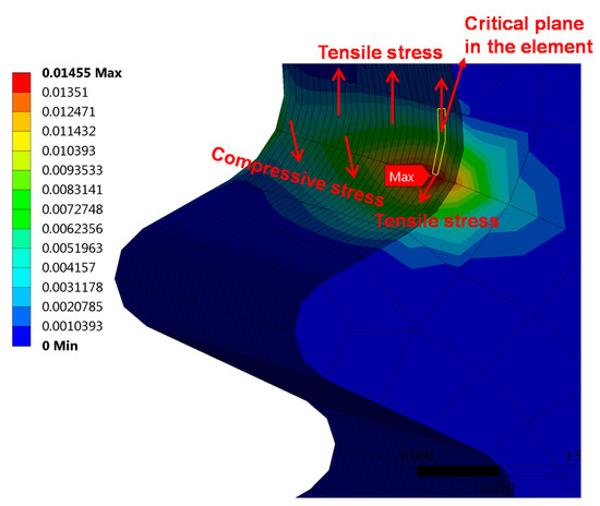 Critical plane approaches were mainly developed on the basis of experimental observations of the nucleation and growth of cracks during loadings. It is generally recognized that fatigue cracks nucleate and propagate on a critical plane [36]. They usually have a better life prediction accuracy under multiaxial stress/strain states than uniaxial fatigue models. Numerous critical plane criteria based on various assumptions and parameters have been developed to describe the fatigue failure processes of different materials. These approaches are typically based on either the maximum principal strain/stress plane or the maximum shear strain/stress plane for different failure types, and can be classified into three categories [37], namely stress criteria, strain criteria and the criteria combining both stress and strain (also energy-based criteria) [15,16,17,18,38,39,40]. Using the critical plane approach, it is the most important to find the critical plane. Figure 1 shows that the critical plane of a component subjected to a complex stress state is usually in the region of its stress-strain concentration.