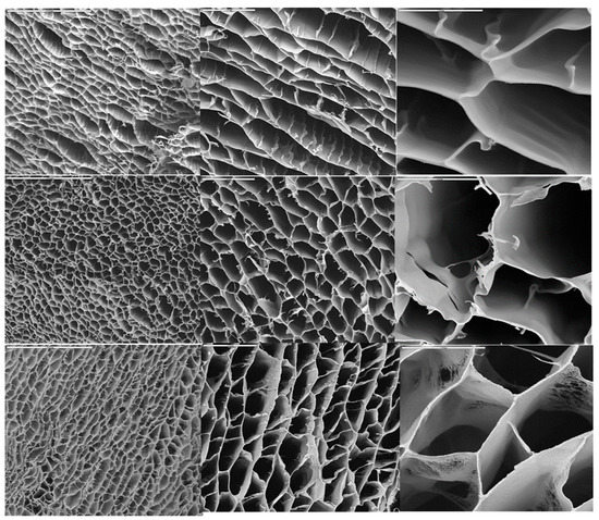 The structure of the macroporous hierarchical structures is shown in Figure 1. In all cases, pore diameters were around 20–50 µm. The sample with the lowest CaP content (ca. 6.25%) exhibited a lamellar-like morphology with low interconnectivity among layers. As the concentration was increased, the structure became honeycomb-like as consequence of the enhanced interconnectivity among layers. The porosity was around 80–85% for every sample no matter the initial Hap content. In particular, the porosity for CSCaP1, CSCaP2 and CSCaP3 was 83.4, 80.1 and 84.6, respectively.